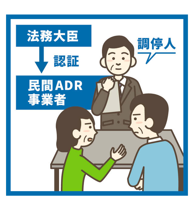 ADRとは、裁判によらず公正中立な第三者が当事者間に入り、話合いを通じて解決を図る手続きです。